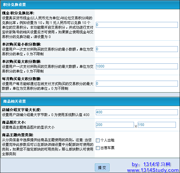 积分转换应对应的是转账的最低余额,主题出售主要包括单主题(附件)最高收入、单主题(附件)最高出售时限(小时)的设置,同样这里也包含了悬赏主题、积分充值、商品主题积分换取商品优惠的设置。