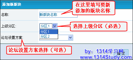 (2)选择上级分区:选择该新添加的版块要录属于哪个分区,为必选项;