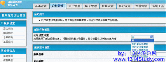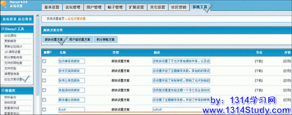 在系统工具->论坛方案设置里,有对内置的一些论坛方案和站长自己保存的论坛方案的管理,可以通过这里来删除、修改、导出和应用(如图 4 所示)这些设置,可以说是十分的快捷和方便。