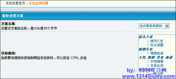 如图 1 所示,在论坛管理->编辑论坛,每个版块的设置里,第一项设置就是选择论坛设置方案。