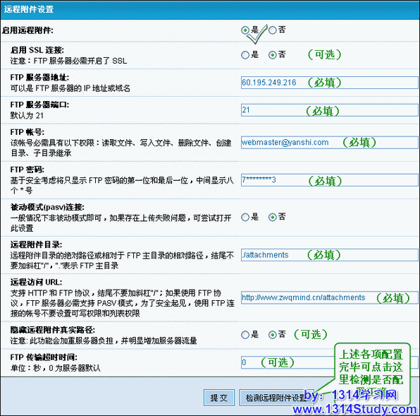 3、远程附件目录:远程附件目录的绝对路径或相对于 FTP 主目录的相对路径,结尾不要加斜杠“/”,“.”表示 FTP 主目录。