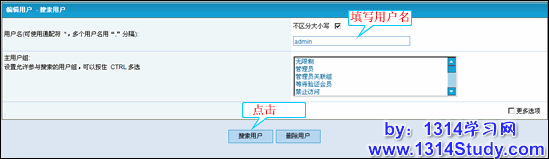在论坛管理里编辑用户如图 3,填写会员的用户名,点“搜索用户”在搜索结果中