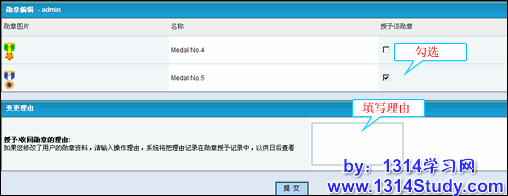 上图中点勋章,会出现下图所示的界面,选择授予用户的勋章,然后输入“变更理由”,提交。