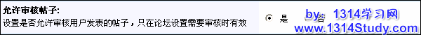 选择您想设置审核的版块,在这里我选择默认版块,点击后面的编辑,即可在帖子选项中看到发帖审核的设置,如图 2 所示: