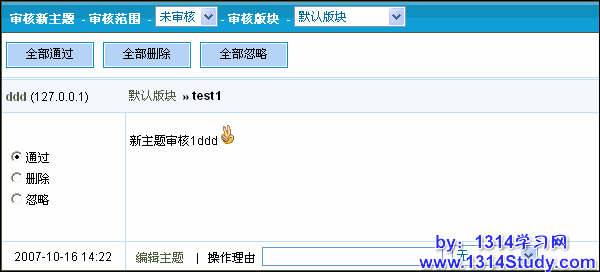 (3) 批量操作:可以点击下面的全部删除,全部通过,全部忽略进行新主题的批量操作。也可以点击每个需要审核的主题左边的单选框进行单个审核。