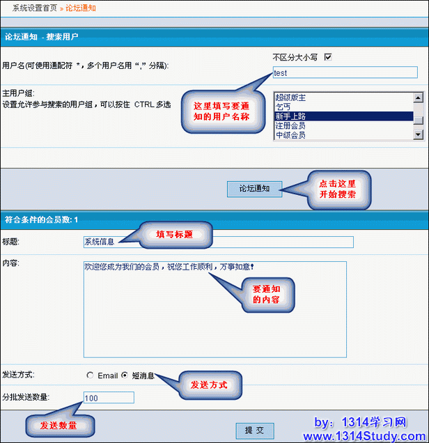 说明:这个功能主要是通知用户,也可以理解为给符合条件的用户群发短消息。下面主要介绍一下这个功能的使用方法。