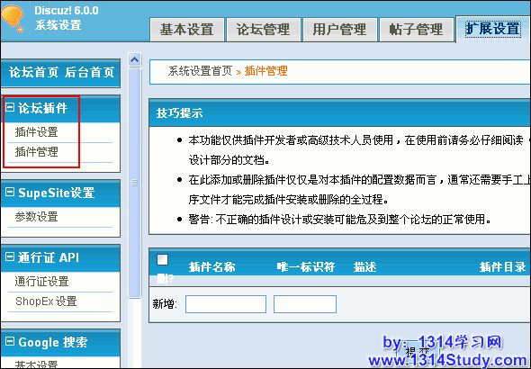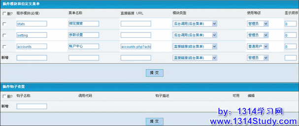 后台调用(后台菜单):可在后台插件设置中为此插件增添一个管理模块,模块文件名指派为“./plugins/插件目录/插件模块名.inc.php”,由 admincp.php 调用此模块。