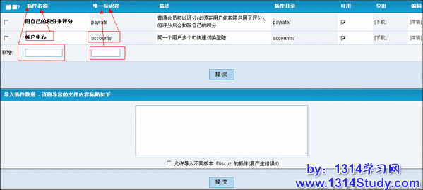 下面的那个导入插件数据,这个文本输入框,这个是把插件作者设计好的配置,直接粘贴,即可导入论坛。如果插件在论坛的版本不一致的情况下开发的,那么勾选上 允许导入不同版本 Discuz! 的插件(易产生错误!!) 即可导入插件的配置详细。