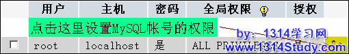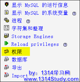 1、打开phpMyAdmin,看到如下图界面,点击“权限”;
