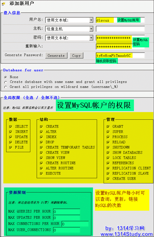 3、设置新添加用户的名称,密码,权限,资源限制,如下图。注意:您需要首先了解一些MySQL语法,然后做权限设置,有些操作是不可恢复的,如“drop”等。