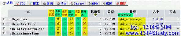 2、如下图所示,可以通过这个页面,了解数据表编码、数据类型、数据表大小、数据表记录数。每个按钮的含义,请看图示。