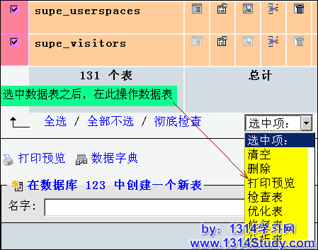 3、选择某个或者某几个数据表之后,在页面下方可以看到“选中项”的下拉菜单,根据您的需求进行数据表操作,包含:清空、删除、打印预览、检查、优化、修复、分析。