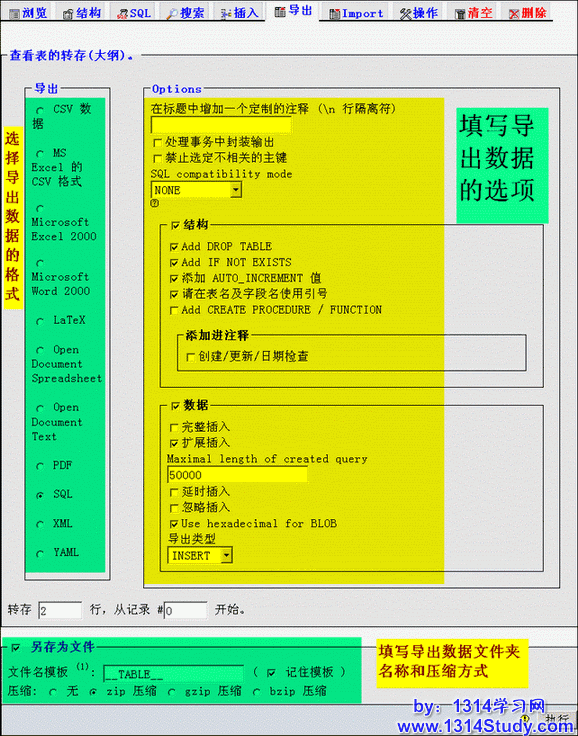 4、导出数据:点击页面上方的“导出”,根据图示,做过滤设置。首先选择导入的数据表类型,选择数据表选项,和导出文件名以及导出文件的压缩方式。