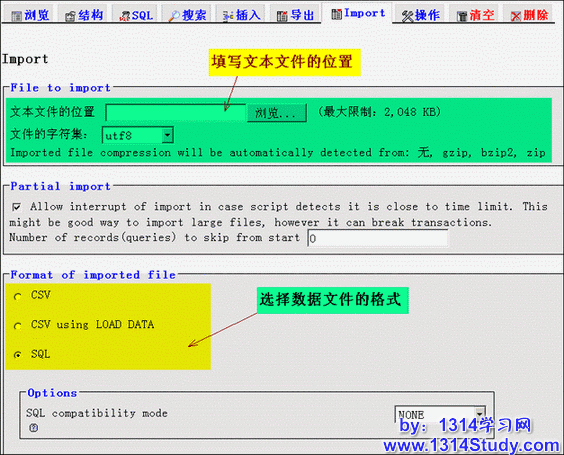 5、导入数据:点击页面上方的“Import”,根据图示,选择数据文件的位置,选择数据文件的格式,即可导入数据库。