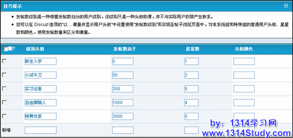 请您根据站点的具体情况,修改级别头衔、每个级别的发帖数限制、每个级别的星星数和不同级别显示的颜色。