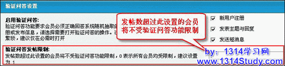 2)、验证问答发帖限制:站长可设置发帖超过一定数量的会员不受此功能限制,既有效的抵御了灌水机,又不影响会员正常发帖,如图 6 所示:
