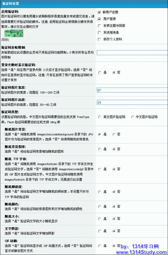 1)、启用验证码:选择启用验证码的操作,有五个选项:新用户注册、用户登录、发表主题与回复、发送短消息、修改个人资料。