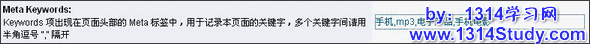 Keywords 项出现在页面头部的 Meta 标签中,用于记录本页面的关键字,多个关键字间请用半角逗号 "," 隔开,如图 2 所示: