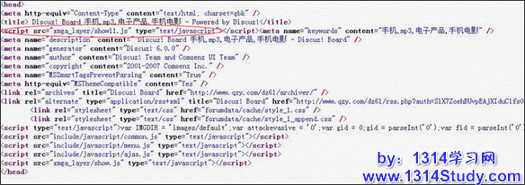 然后打开论坛前台的一个页面,查看源文件,就会看到添加的那段代码已经在之间了,效果如图 4 所示: