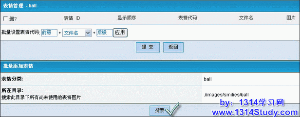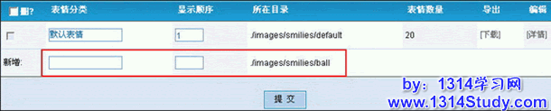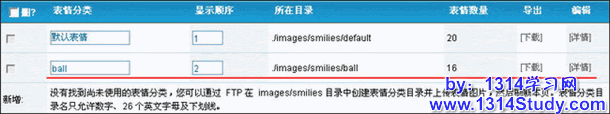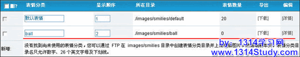 返回“系统设置 - 帖子管理 - 帖子相关 - 表情管理”,我们就可以看到添加好的名为“ball”的表情分类及其所在目录、表情数量等等信息,如图 10 所示: