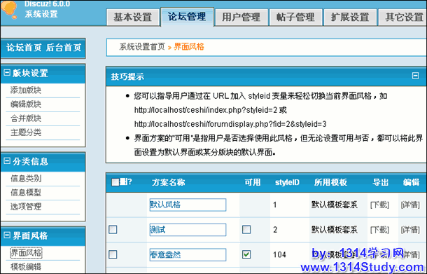 进入论坛后台“系统设置 - 论坛管理 - 界面风格”,编辑某个风格,即点击某个风格的“详情”,举例默认风格如图 11 所示: