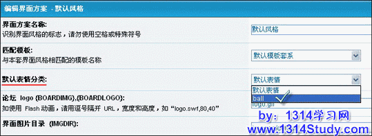 上图界面中进入“编辑界面方案”,选择“默认表情分类”为我们新添加的“ball”,如图 12 所示,然后提交。