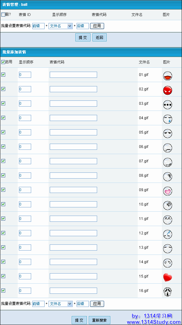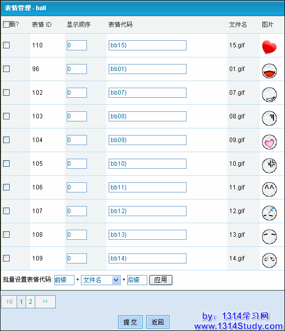上图中添加完毕表情代码后“提交”,则表情分类名为“ball”的表情添加完毕,其表情管理界面如图 9 所示:在此界面你还可以继续修改表情代码及其显示顺序等等。