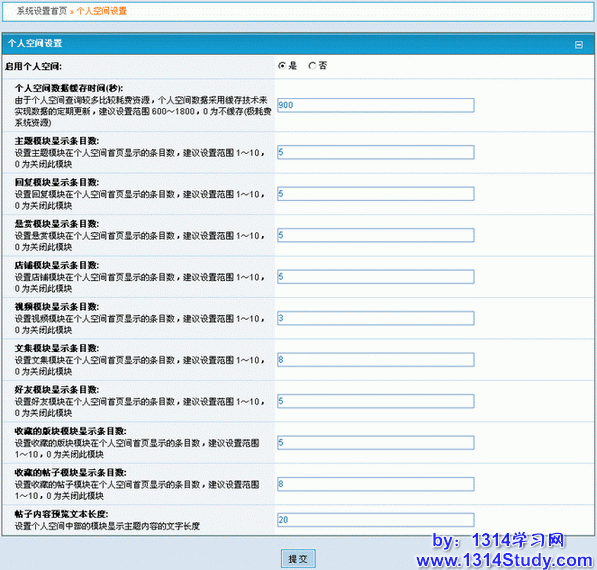 管理员在系统设置里打开个人空间,这里的个人空间是指论坛自带的空间,而不是 SupeSite/X-Space 提供的空间。管理员可以设置会员个人空间里每一个模块显示的条数,设置如下: