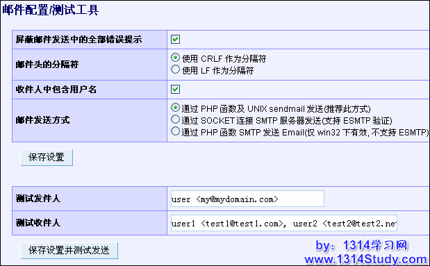 调试好邮件发送配置后点击“保存设置”则当前邮件设置将被写入程序根目录的 mail_config.inc.php 文件。