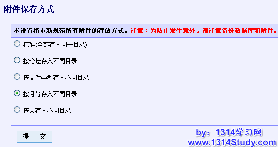 将您现在的附件存储方式按照指定方式进行目录结构调整并重新存储。本设置将重新规范所有附件的存放方式,主要有以下五种保存方式:标准(全部存入同一目录)、按论坛存入不同目录、按文件类型存入不同目录、按月份存入不同目录、按天存入不同目录。如图 12 所示: