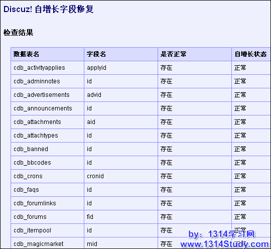 自动检索论坛所有的数据表,可修复自增字段丢失的问题。修复结果如图 16 所示: