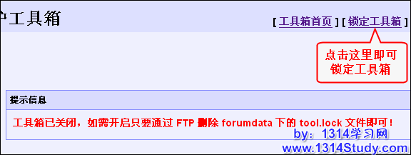 * 当您使用完毕 Discuz! 系统维护工具箱后,请点击锁定工具箱以确保系统的安全!下次使用前只需要在 /forumdata 目录下删除tool.lock文件即可开始使用。锁定方法如图 18 所示: