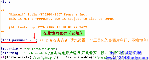 下载压缩包后用写字板或者记事本打开 tools.php 文件,在文件首部设置一个使用密码。如图 2 所示: