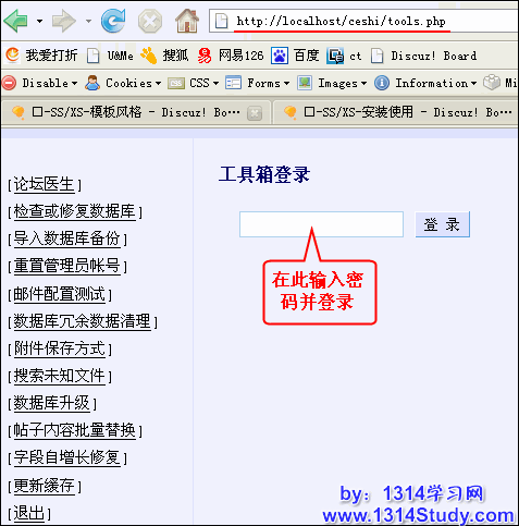 上传 tools.php 至论坛程序根目录,通过 URL 地址访问 tools.php 文件即可使用本工具箱。如图 3 所示: