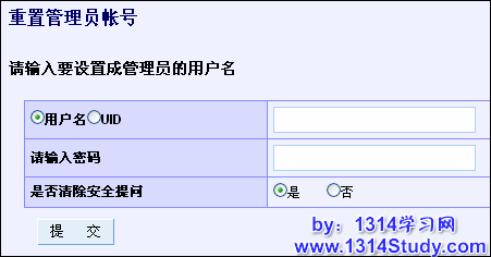 如图 9 所示,填写“用户名”或者“UID”,输入“密码”,然后选择“是否清除安全提问”即可重置管理员密码。