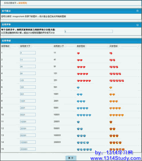 DZ系统设置-----扩展设置-----电子商务-----诚信规则。 为站点的买卖家设置诚信规则,通过信用度值设置信用图标!站点的会员可以很方便的看到买卖双方的信用度。