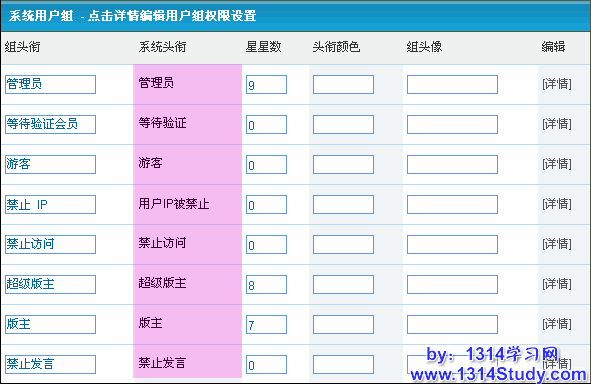 点击各用户组最右边的“详情”就可以编辑该用户组的权限,主要有以下关于权限的设置:
