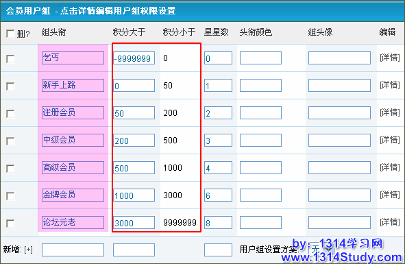 注:会员用户组至少分为两组,其积分下限分别为负值(任一负数)和 0,否则将导致部分用户无法与用户组匹配的问题。所以这里提醒各位站长不要把这里都删空。
