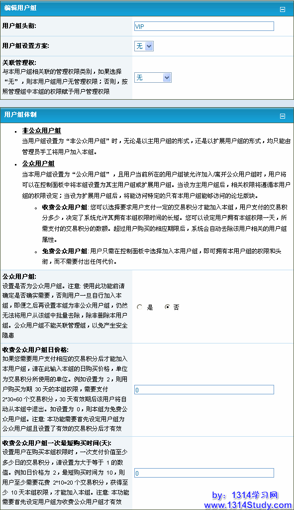 您可以选择要求用户支付一定的交易积分才能加入本组,用户支付的交易积分多少,决定了系统允许其拥有本组权限时间的长短。您可以设定用户拥有本组权限一天,所需支付的交易积分的数额。超过用户购买的相应期限后,系统会自动去除该用户相关的用户组属性。