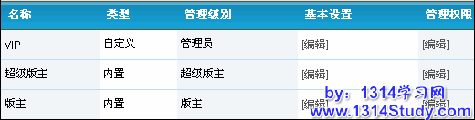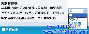 (1)关联管理权:与本用户组相关联的管理权限类别,如果选择“无”,则本用户组用户无管理权限;否则,按照管理组中本组的权限赋予用户管理权限。如图 14 所示,有三个选项:管理员、超级版主、版主。比如这里选择“管理员”,则“VIP”该特殊用户组的会员就具有了管理员的管理权限,虽然他不是管理员。