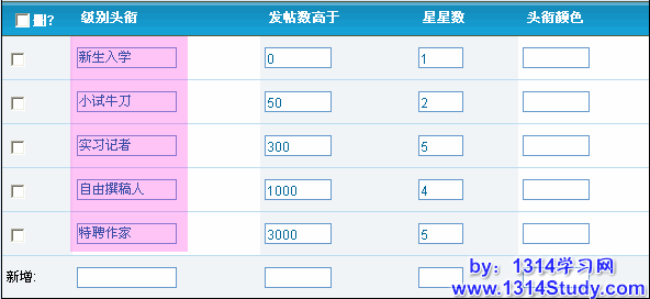 Discuz! 系统默认有“新生入学”、“小试牛刀”、“实习记者”、“自由撰稿人”、“特聘作家”五个发帖数级别头衔。如图 16 所示: