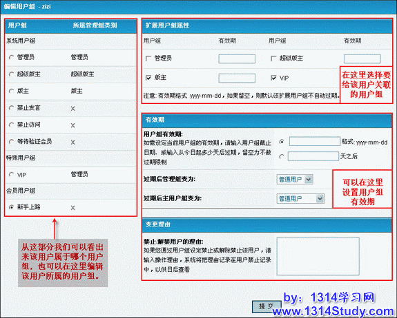 在这个界面上,管理员可以修改该用户所属的用户组(左边),可以为其设置扩展用户组(右上),还可以设置用户组的有效期(右下)。
