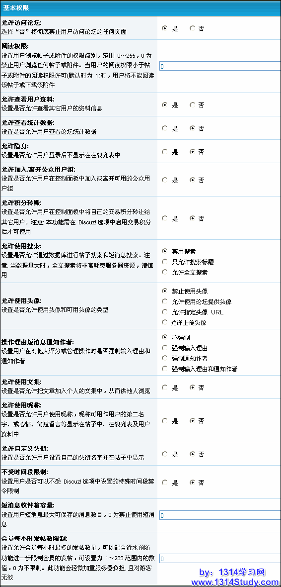 1)允许访问论坛:选择“否”将彻底禁止用户访问论坛的任何页面。