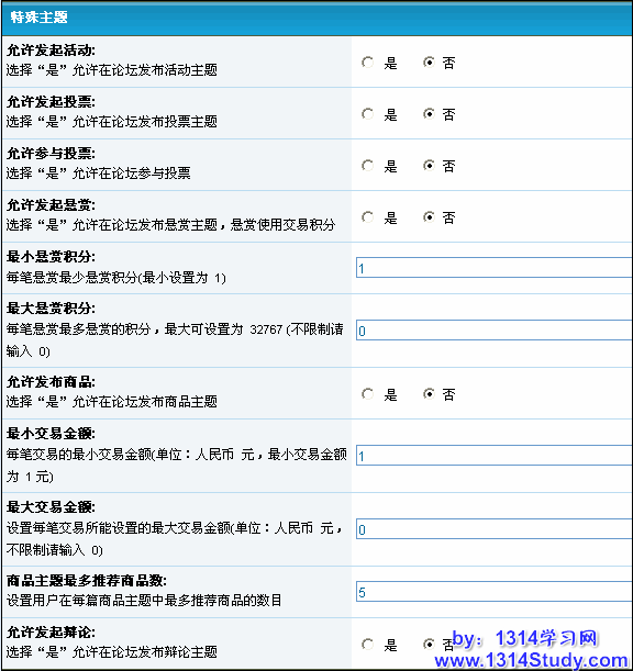 4)允许发起悬赏:选择“是”允许在论坛发布悬赏主题,悬赏使用交易积分。