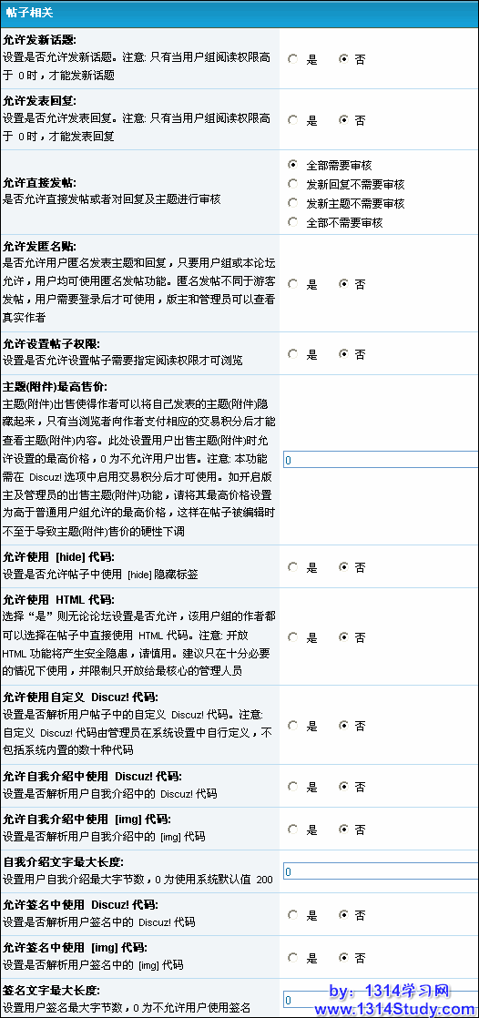 1)允许发新话题:设置是否允许发新话题。注意: 只有当用户组阅读权限高于 0 时,才能发新话题。