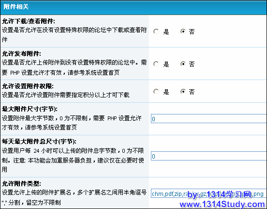 2)允许发布附件:设置是否允许上传附件到没有设置特殊权限的论坛中。需要 PHP 设置允许才有效,请参考系统设置首页。