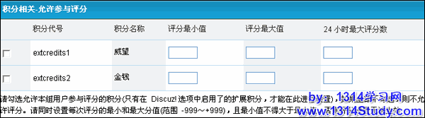 请勾选允许本组用户参与评分的积分(只有在 Discuz! 选项中启用了的扩展积分,才能在此进行设置),如果全部不勾选,则不允许评分。请同时设置每次评分的最小和最大分值(范围 -999~+999),且最小值不得大于最大值,否则评分设置无法生效。