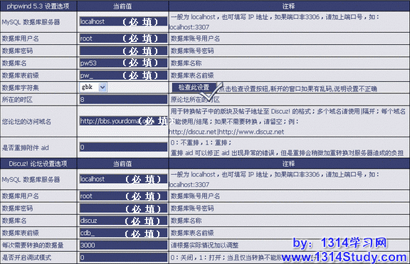 (1)、phpwind 5.3 数据库字符集:有 GBK、utf8、BIG5 三种,如果你不知道自己网站的数据库字符集,选择其中的一种,点击右方的“检查此设置”,程序就会提取你填写的 pw 库里的一些数据转换做个测试,如果显示正常就说明你的数据库字符集就是这个,否则重新选择检查此设置直到显示正常为止。