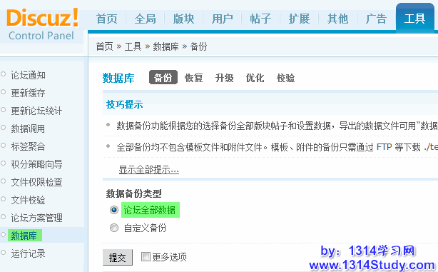 虚拟主机用户推荐直接在论坛后台进行备份,用管理员登录论坛后台 => 工具 => 数据库 => 备份:推荐备份“论坛全部数据”