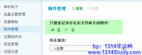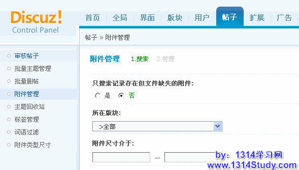 论坛自带了对附件的管理功能。通过这个管理功能,管理员可以根据条件搜索附件,对搜索到的附件进行删除、下载、打开附件所在主题,还可以对附件的数据表进行整理,将服务器上已经不存在的附件的信息在数据表中删除,减小附件表的数据量,进而增加附件检索的速度。